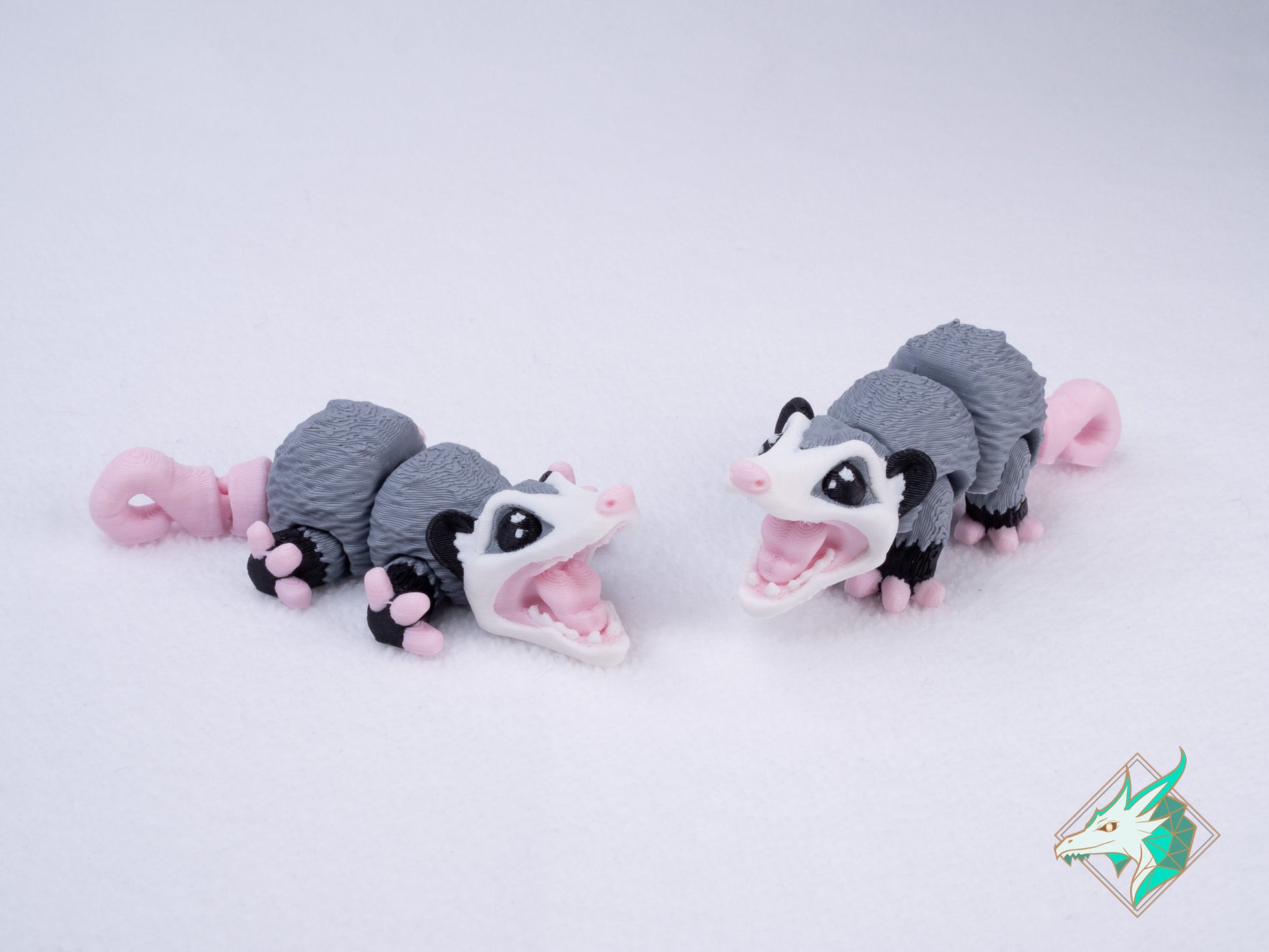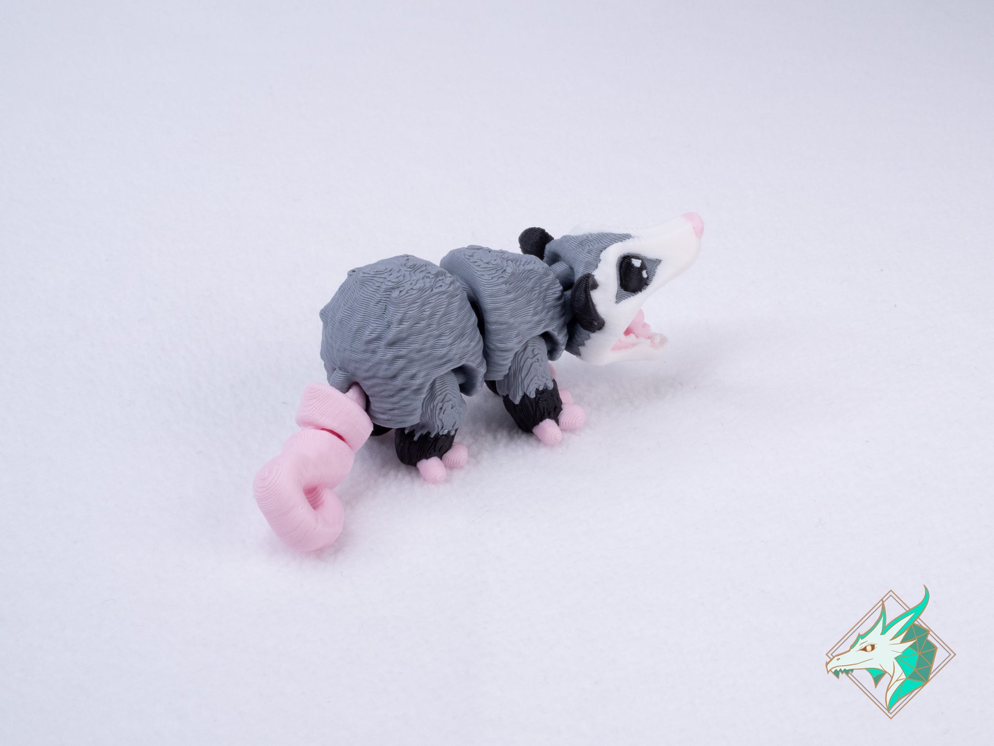 Description : Un opossum hurlant avec une boucle dans sa queue